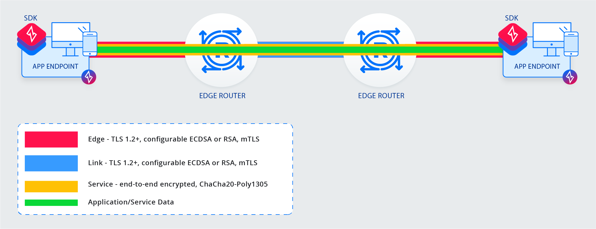 Connections between SDKs and Edge Routers are called edge connections. edge connections are multiplexed and carry multiple service connections. Each connection is for a specific service and secured with end-to-end encryption in order to transport application/service data securely between the two intended parties only.